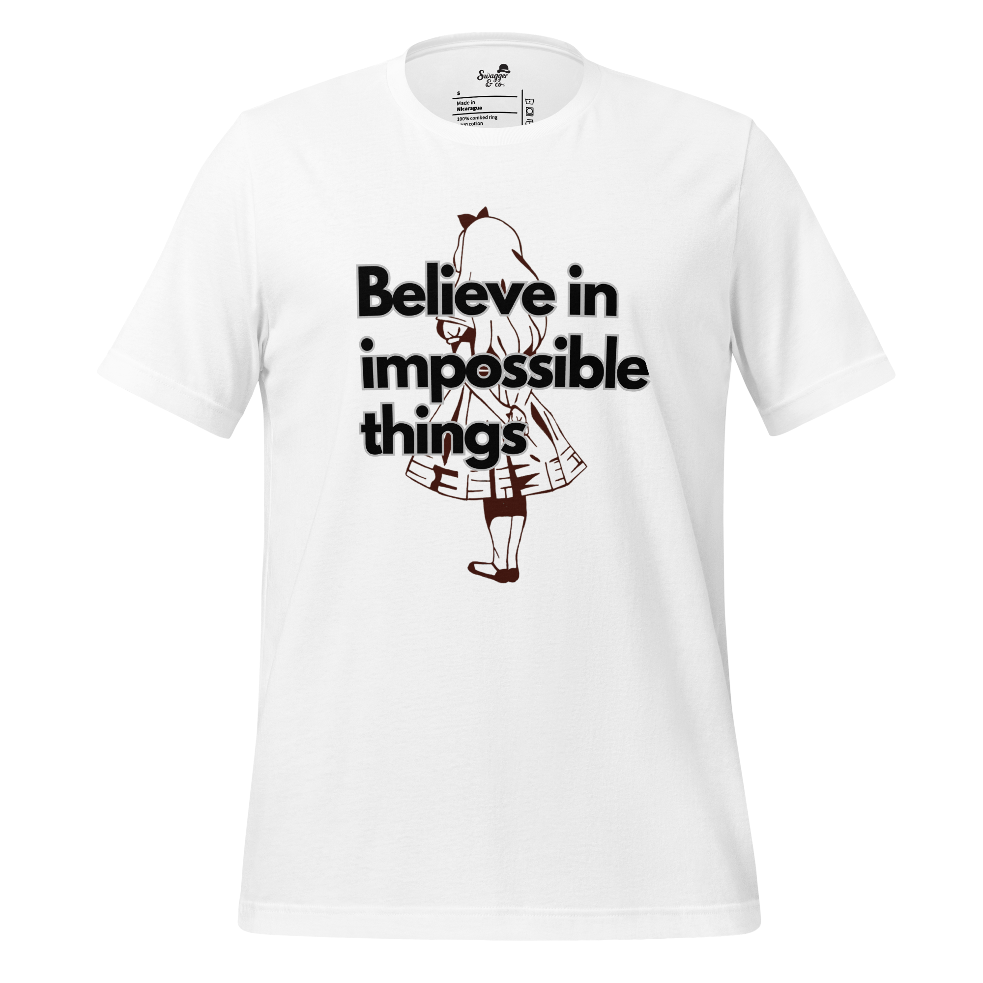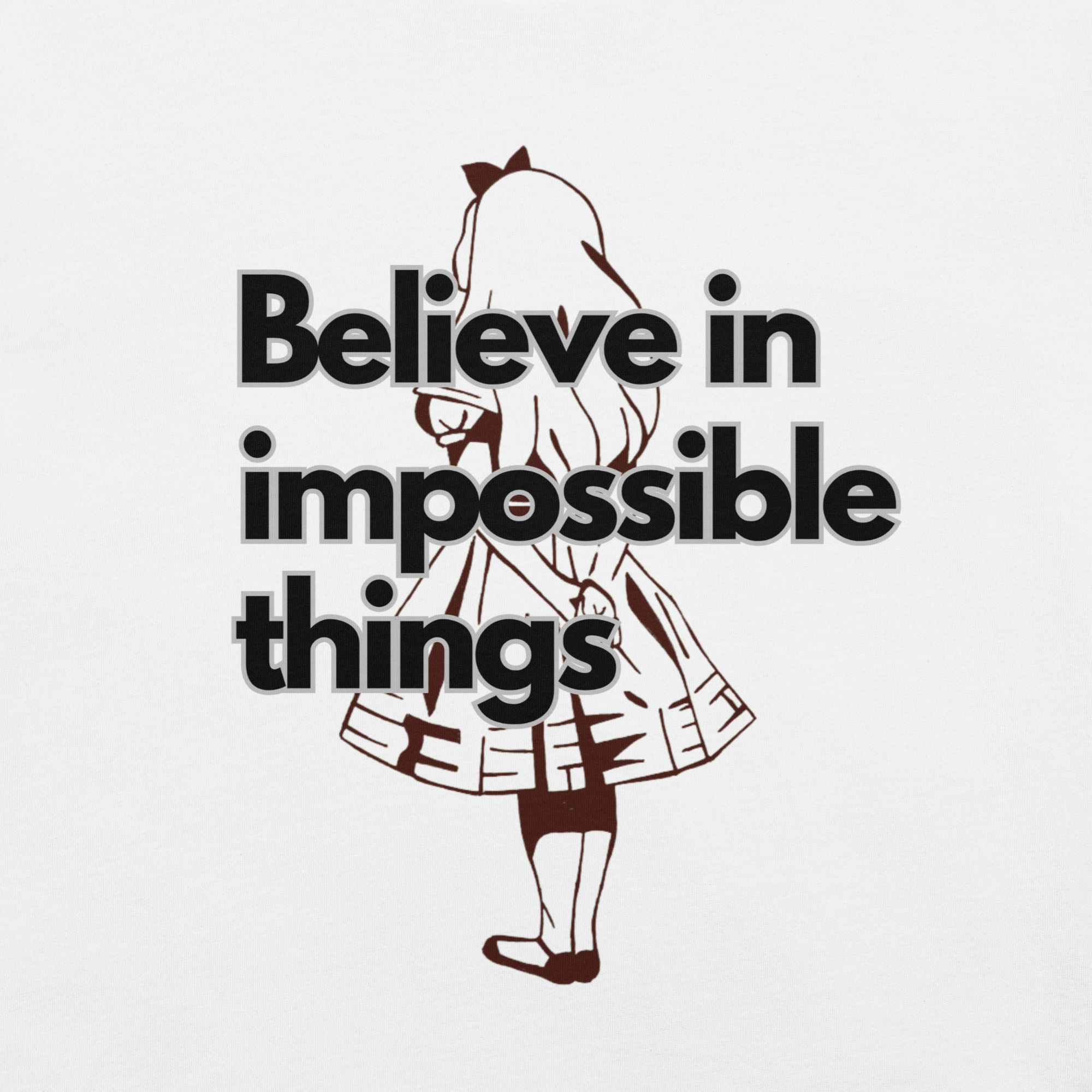 This limited edition 'Believe in Impossible Things' Wonderland-inspired design is printed on the ultimate, super soft, lightweight, adult, unisex T-shirt.